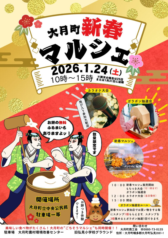 おいしい食べ物が集まる大月町のごちそうマルシェに、カラオケ大会や音楽演奏のほか、おもちつき、ガラポン抽選会も開催されます☆