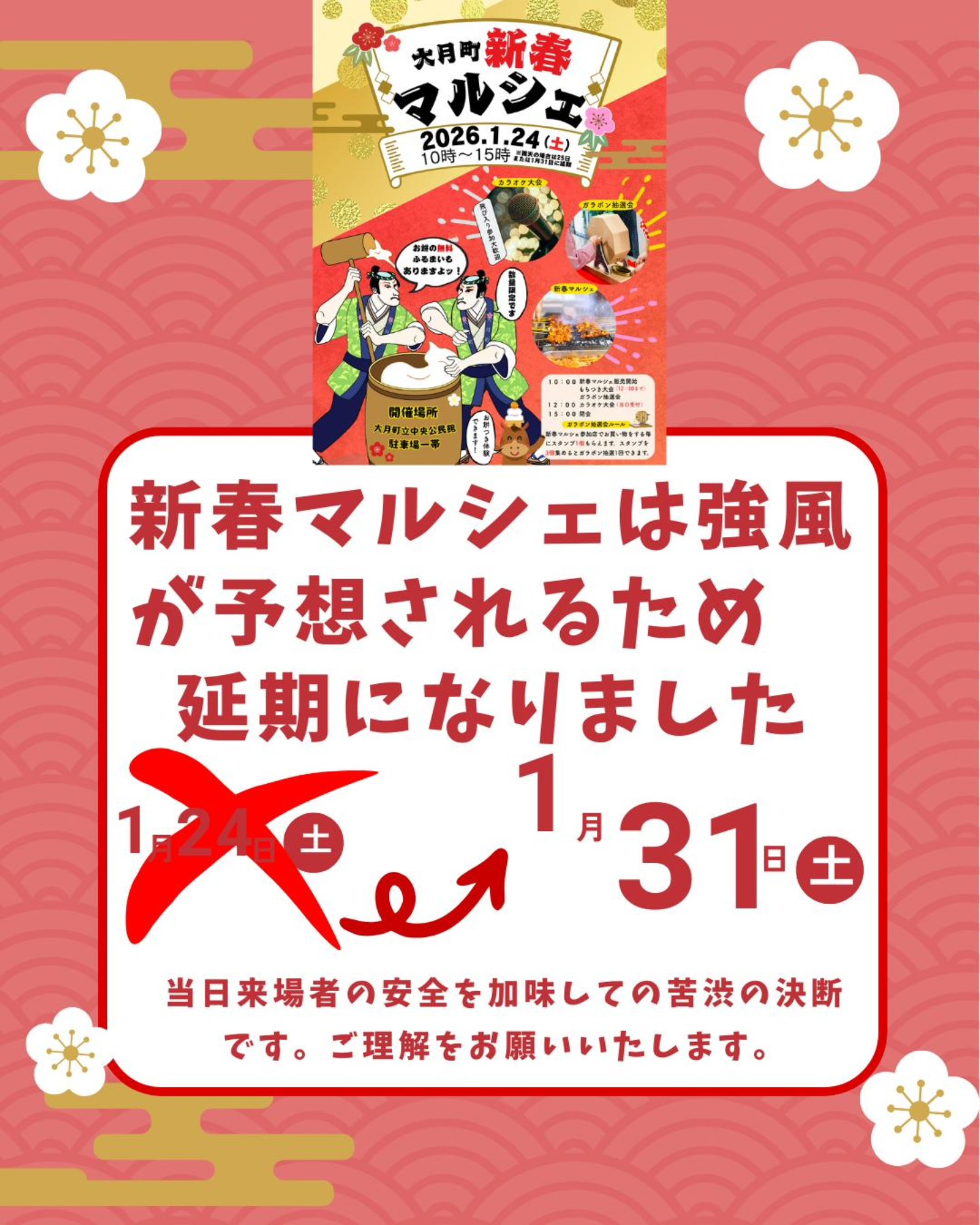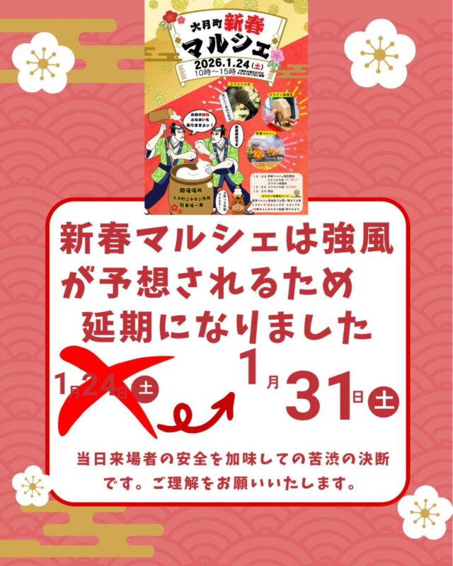 1月24日(土)に開催を予定しておりました『第3回新春マルシェ』ですが、当日強風が予想されるため、1月31日(土)に延期となりました。